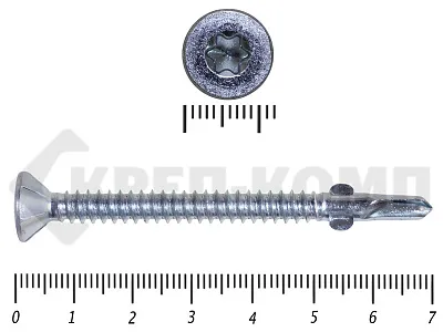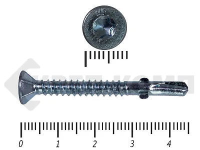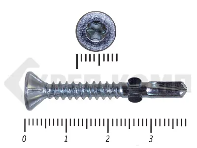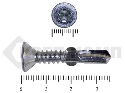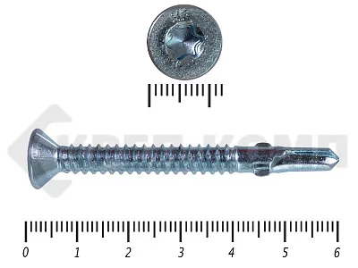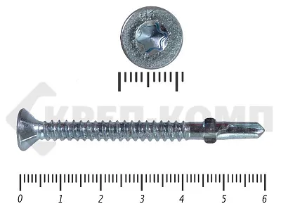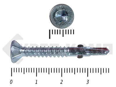 Конструкционные (Флюгельные) саморезы (дерево-металл), применяются для крепления деревянных досок к металлическим конструкциям. На конце самореза, чуть выше сверла, есть ушки, которые при прохождения дерева, рассверливают его, для тог, что бы саморез не касался стенок доски. Это делает закручивание самореза более простым, и надежнее прижимает доску к металлическому основанию. Кода сверло самореза достигает металла, ушки обламываются, и далее саморез легко вкручивается в металл, прижимая доску.